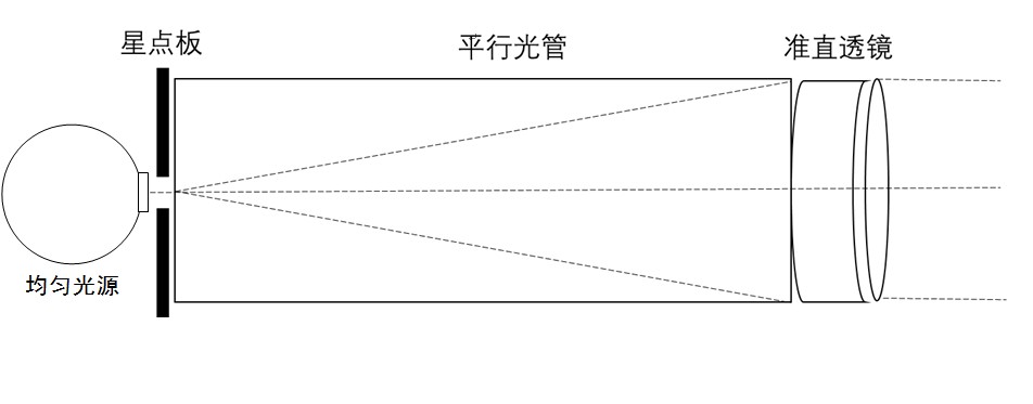 均勻光源經(jīng)過(guò)星點(diǎn)板后,再由平行光管準(zhǔn)直出射光,在30m遠(yuǎn)處形成直徑80mm的光斑,光斑亮度滿(mǎn)足-1~7等星的亮度要求,平行光管將光線(xiàn)準(zhǔn)直,發(fā)散角小于 0.003°,出射光亮度通過(guò)調(diào)節(jié)光源電流進(jìn)行控制。