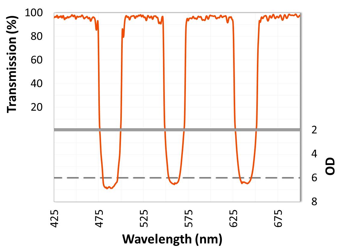 ULTRA系列多陷波濾光片可以設(shè)計(jì)成在帶之間具有比OD8更大的截至深度,**的截至陡度和高達(dá)98%的透過率。它們非常適用于需要同時(shí)阻斷多條激光線的應(yīng)用。